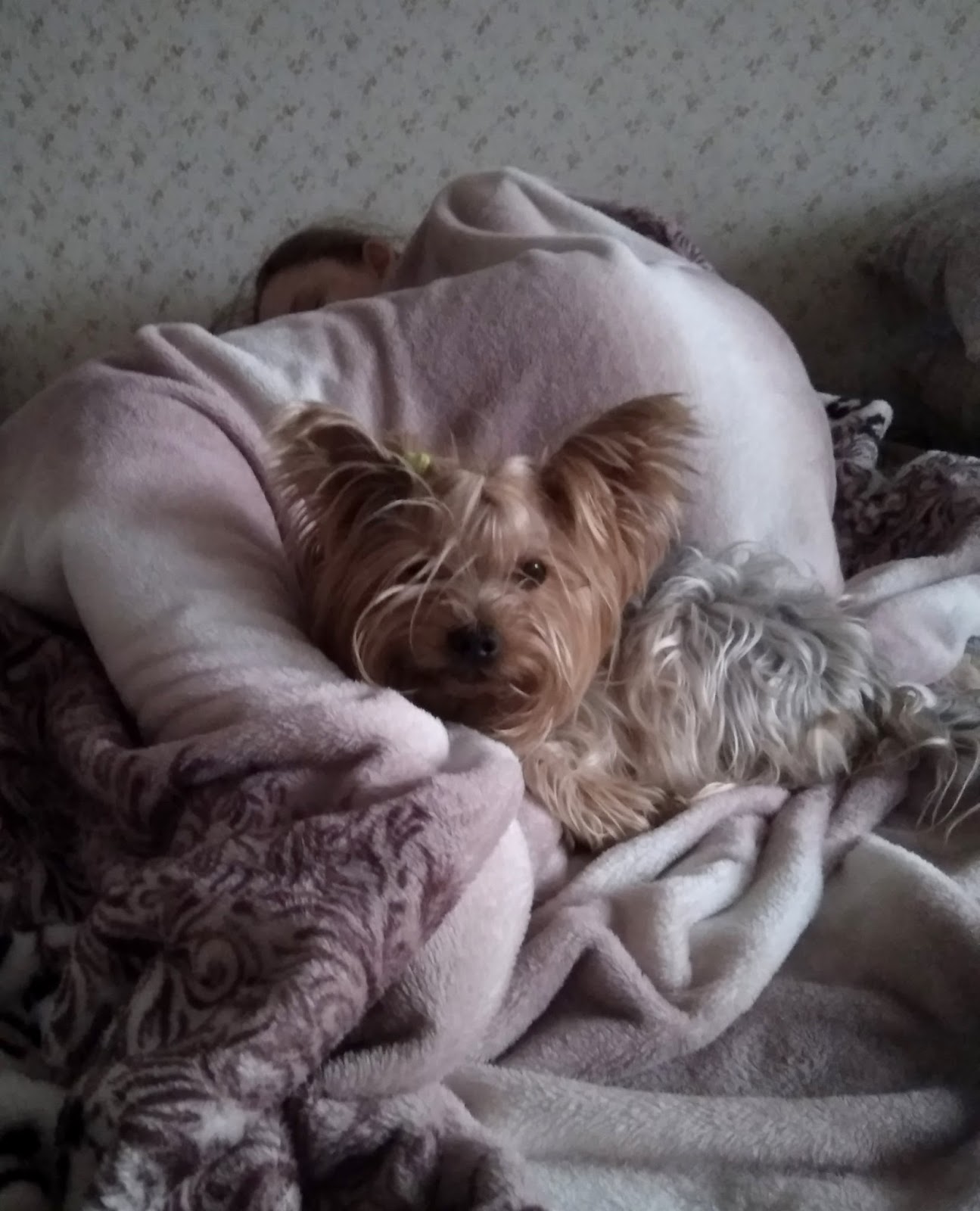 Или так (так, стати, предпочтительней, морду на маму положил, уж точно не сбежит, а то она дама такая, непредсказуемая, вроде сидела-сидела рядом, только задремал, все, куда-то делась)
